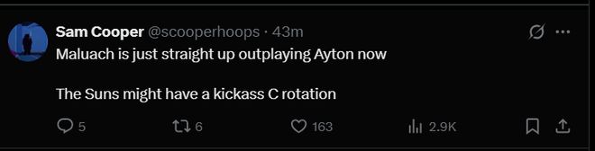 “马鲁阿奇现在完胜艾顿。太阳可能拥有令人惊叹的中锋轮换阵容。”