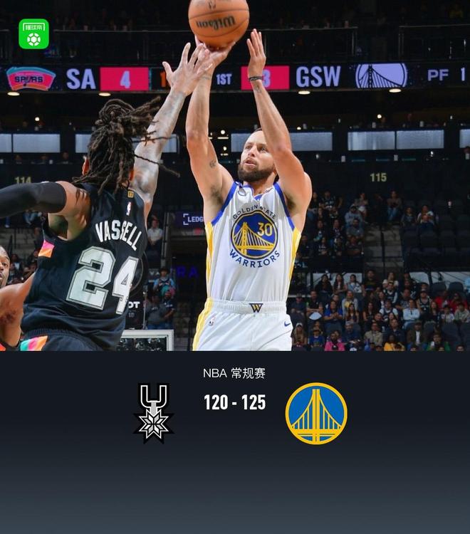 勇士125-120逆转马刺,库里46分,文班亚马31+15+10+8失误,巴特勒28+8