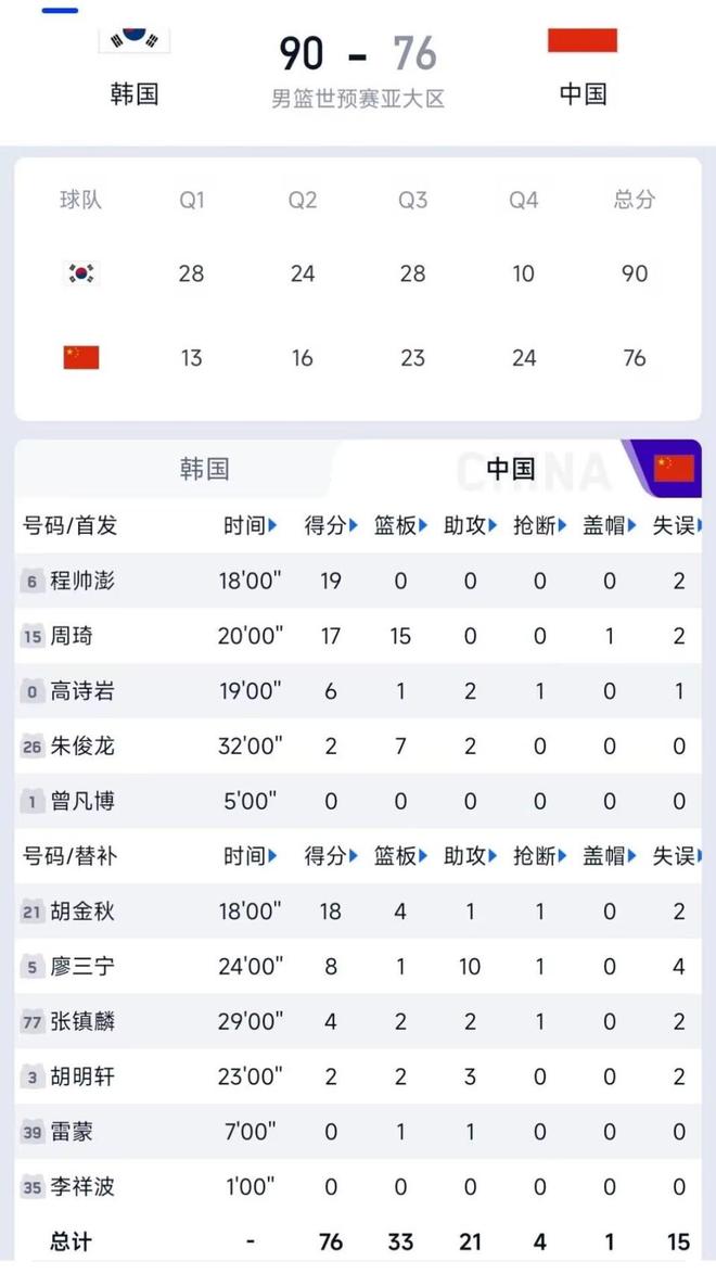中国男篮76-90惨负韩国!张镇麟上半场0分!胡明轩,正负值-25